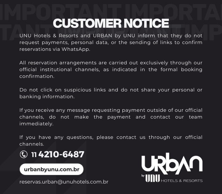 The URBAN by UNU Osasco hotel offers 120 modern apartments designed to provide a unique experience for our guests. All apartments feature plenty of natural light, balconies, amenity kits, wireless internet, cable TV, a Smart TV, a safe, a minibar, a gym, parking, laundry service, and a restaurant open to the public with a delicious breakfast and 24-hour room service.